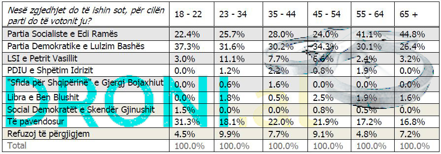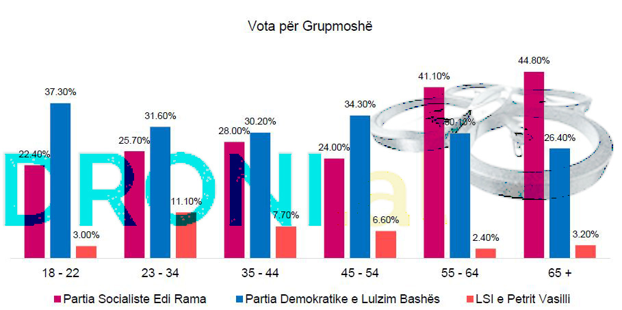 Partia Demokratike ka përparësi mes të rinjve të moshës 18–34 vjeç, ndërsa votuesit më të shumë të Partisë Socialiste janë mbi 55 vjeç. LSI ka përparësinë më të madhe të saj në elektoratin e përbërë nga grupmosha 23 – 44 vjeç dominuar nga grupmosha 23 – 34 vjeç.
