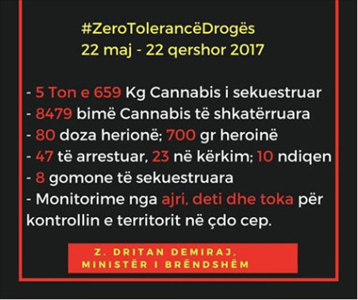 “Vazhdon me sukses lufta pa kompromis kundër kanabisit dhe përdorimit të parave të drogës në fushatën elektorale.