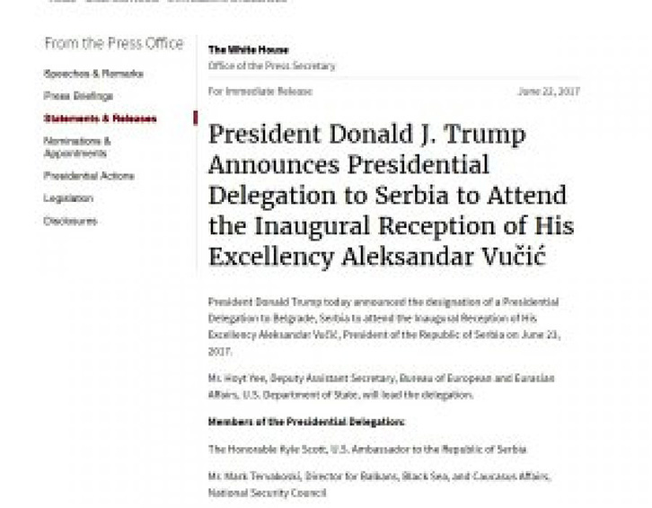 Presidenti i SHBA, Donald Trump, ka promovuar sërish me një mision special në Ballkan kreun e Byrosë së Euroazisë në DASH, Brian Hoyt Yee, që e ka emëruar si kreu i delegacionit amerikan në ceremoninë e inaugurimit të Presidentit të Serbisë, Aleksandër Vuçiç.