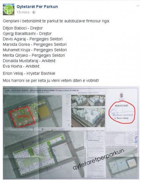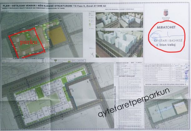 Pas denoncimit të qytetares, grupi i aktivistëve “Qytetarët për Parkun” ka publikuar projektin e plotë të prishjes së parkut të autobuzave, ku do të ndërtohet një kompleks pallatesh, i firmosur nga kryebashkiaku Erion Veliaj.
