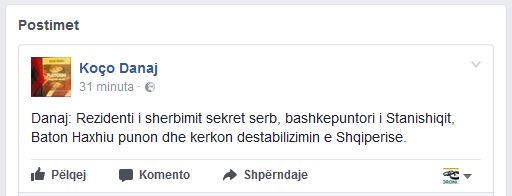 Danaj përmes një statusi në “Facebook”, ka akuzuar Haxhiun si bashkëpunëtor të shërbimit sekret serb.