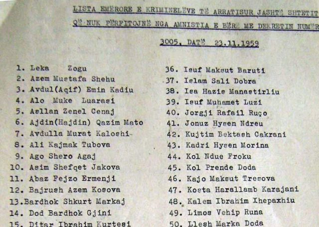 Ky dokument me fjalinë shoqëruese “Lista emërore e kriminelëve të arratisur jashtë shtetit që nuk përfitojnë nga amnistia e bërë me dekretin nr. 3005, datë 23.11.1959”, nuk njihet deri sot. Atë e hartuan oficerë Sigurimi që punonin në atë kohë në Ministrinë e Rendit Publik. Çdo pikë e kalimit kufitar kishte urdhër t’i ndalonte personat e kësaj liste të hynin në Shqipëri.