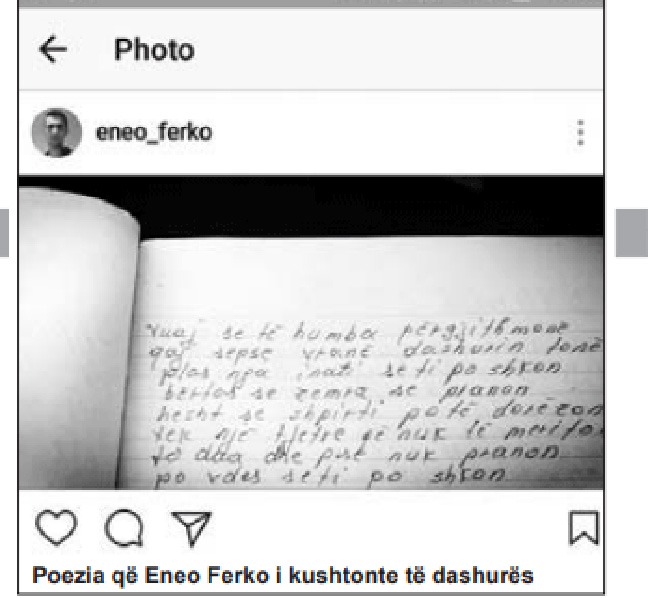 Eneo Ferko, vetëm 20 vjeç, i dha fund jetës në gjendje të rënduar psikologjike, pasi u nda nga e dashura. Ai ishte në prag fejese me të dhe kishte thurur ëndrra për të ndërtuar bashkë të ardhmen, por sipas dëshmive të miqve, ajo nuk e ka dashur më, duke u larguar prej tij. Vajza ishte vetëm 17 vjeçe.