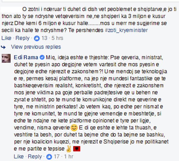 Rama: Miq, ideja eshte e thjeshte: Pse qeveria, ministrat, duhet te pyesin apo degjojne vetem vartesit dhe mos pyesin e degjojne edhe njerezit e zakonshem?! Une mendoj se teknologjia e re, permes kesaj platforme, na jep nje mundesi fantastike qe te bashkeqeverisim realisht, konkretisht, dhe njerezit e zakonshem mos jene viktima pa goje perballe padrejtesive qe u behen ne zyrat e shtetit, po te mund te komunikojne direkt me qeverine e tyre, me ministrin perkates! Jo vetem kaq, po edhe per nismat e tyre ne komunitet, te mund te gjejne vemendje e mbeshtetje, si edhe te ndajne ne kete platforme opinionet e tyre per ligje, vendime, nisma qeverie😊 E di qe eshte e lehte ta thuash, e veshtire ta besh, por duhet ta bejme dhe do ta bejme se bashku, per nje koalicion kuqezi, me njerezit e Shqiperise jo me politikanet e me partite e tepsise✌️🇦🇱