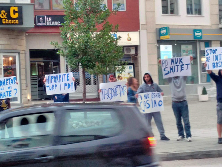 Jashtë dhe brenda sallës ku po zhvillohet takimi demokratët i kanë pritur deputetët me pankarta ku shkruhej “Mosmirënjohës”, “Të shitur”, “Bukëshkalë”.