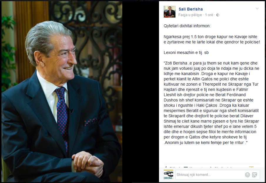 “Zoti Berisha, e para ju them se nuk kam qene dhe nuk jam votuesi juaj po doja te ndaja me ju dicka ne lidhje me kanabisin. Droga e kapur ne Kavaje i perket klanit te Altin Qatos ne polici dhe eshte kultivuar ne zonen e Therepelit ne Skrapar nga Tur Hajdari dhe njerezit e tij nen kujdesin e Fatmir Lleshit ish drejtor policie ne Berat Ferdinand Dushos ish shef komisariati ne Skrapar qe eshte shoku i ngushte i Haki Çakos. Droga ka kaluar mespermes Beratit e siguruar nga shefi komisariatit te Skraparit dhe drejtorit te policise berat Dilaver Shimaj te cilet kane marre pjesen e tyre. Ne Skrapar ishte emeruar dikush tjeter shef po e lane vetem 5 dite dhe e hoqen sepse filloi te merrte informacion per drogen e Qatos dhe ketyre shokeve te tij.Anonim ju lutem se kemi femije per te rritur .”