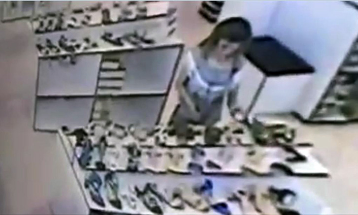 Nga pamjet shihet se ajo bën sikur shikon një palë sandale në dyqanin e këpucëve, por pastaj merr celularin e fut në çantë dhe largohet me shpejtësi.