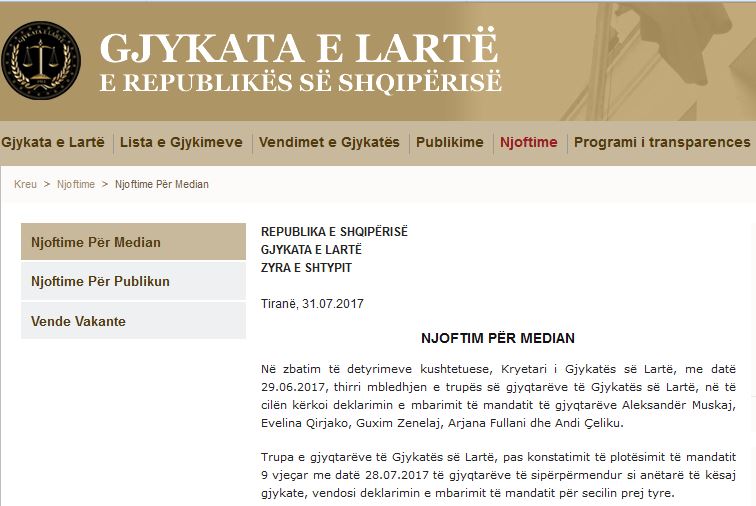 Lidhur me dorëzimin e detyrës nga këta gjyqtarë, Kryetari i Gjykates se Lartë, më datë 31.07.2017 njoftoi edhe Presidentin e Republikës.