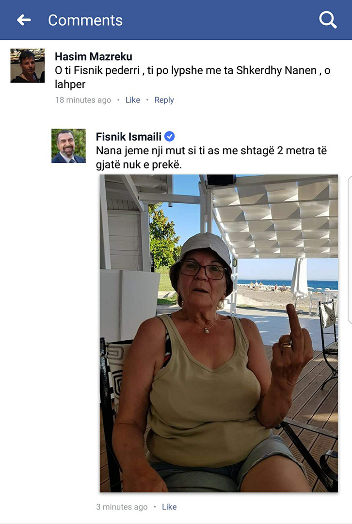 “Ai momenti kur një dashamirë i SHIK-ut të shan me nanë, e ty të qëllon nana afër”, ka shkruar deputeti Fisnik Ismali në “Facebook”, ku ka publikuar një fotografi të nënës së tij, e cila shihet se e ka të ngritur gishtin e mesit…