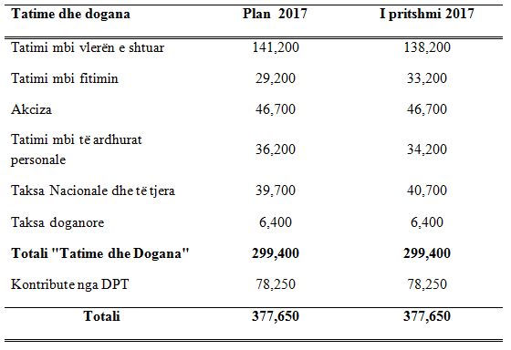 Gjithsesi pritshmëritë për totalin e të ardhurave nga tatimet, doganat dhe kontributet e sigurimeve mbeten të njëjta me planin e fillim vitit në nivelin e 377,6 miliardë lekëve.