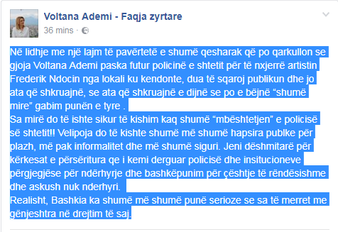 Kryetarja e Bashkisë së Shkodrës Voltana Ademi ka reaguar sot pas deklaratave të këngëtarit Frederik Ndoci, i cili e akuzoi se ajo fshihet pas ndërhyrjes së Policisë në një lokal ku ai këndonte në Velipojë, për ta ndaluar.