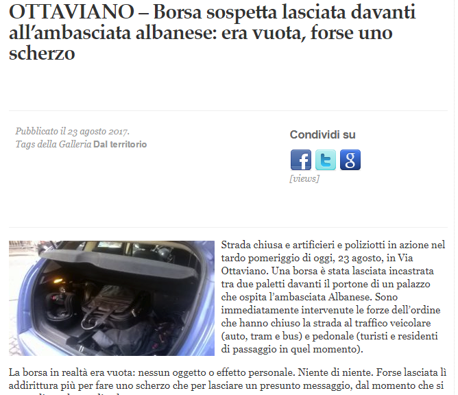 Sipas mediave italiane, çanta që alarmoi policinë ishte lënë mes dy hekurave para derës së një pallati, pranë Ambasadës shqiptare, gjatë rrugës së njohur si Ottaviano.