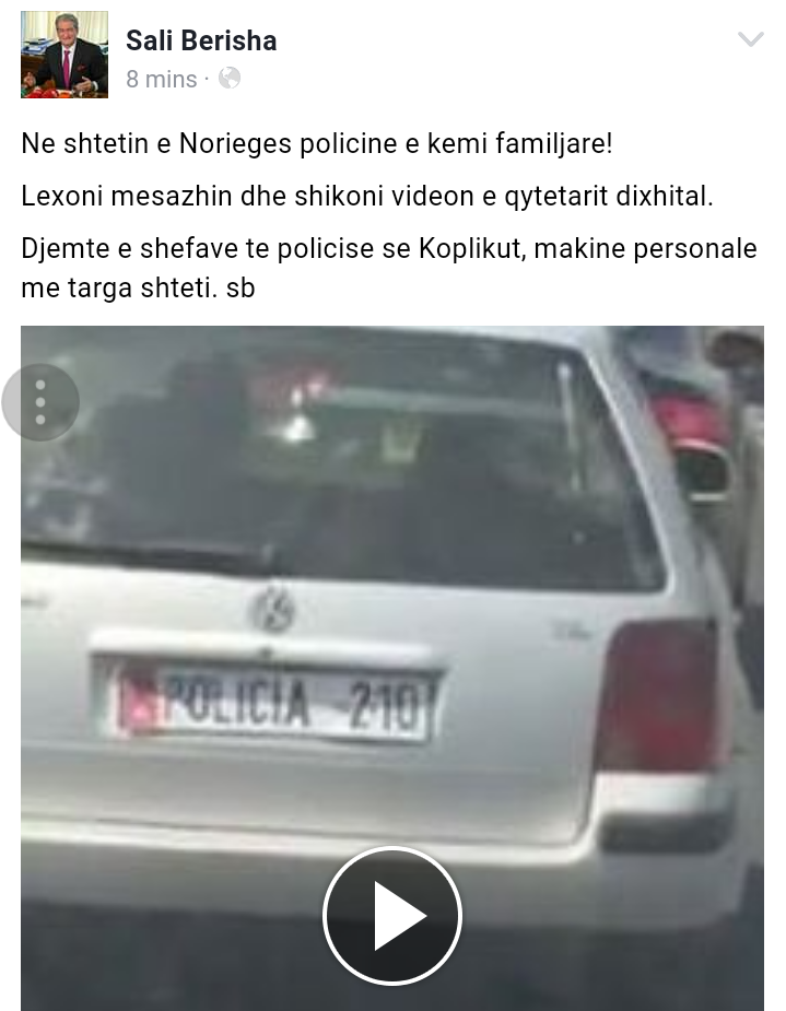 Ish-Kryeministri i Shqipërisë, Sali Berisha ka denoncuar shefat e policisë së Koplikut. Me anë të një statusi në facebook ai shprehet se fëmijët e shefave të policisë në Koplik përdorin makinat personale me targat e shtetit. Më poshtë keni statusin e z.Berisha dhe një video të ardhur nga qytetati digjital.