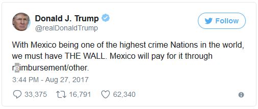 “Duke qenë Meksika është një nga kombet më të mëdha kriminale në botë, ne duhet të kemi murin, Meksika do ta paguajë atë nëpërmjet një rimbursimi apo mënyre tjetër”.
