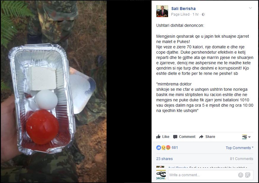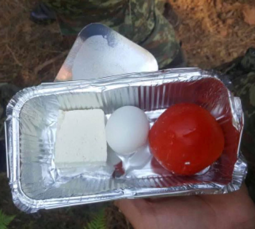 Ushtarët shqiptarë të NATO-s që në këto ditët e nxehta të verës, janë angazhuar për shuarjen e zjarreve të shumtë, ushqehen me një kokërr vezë të zier, një kokërr domate dhe një copë djathë.