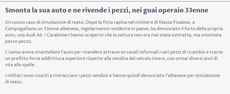 Një rast i ri i simulimit të krimit, këtë herë i bërë nga një shqiptar ka lënë pa fjalë policinë italiane. Një 33-vjeçar, rezident i rregullt në Shqipëri, denoncoi vjedhjen e makinës së tij, një “Audi” A6. Karabinieria zbuloi se makina nuk ishte marrë kurrë, por copëtua e shkatërruar