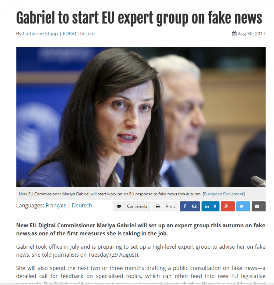Fakenews ose ndryshe “lajmet e rreme”, duket se tashmë janë bërë edhe një shqetësim politik për Bashkimin Europian. Media e BE-së “Euractiv” i është referuar për këtë hap, komisionieres së sapo emëruar për Dixhitalizimin, Mariya Gabriel, e cila deklaroi se shumë shpejt do të krijohet një grup ekspertësh për të vlerësuar në kohë publikimin e lajmeve të rreme nga platformat on-line.