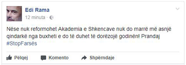 “Nëse nuk reformohet Akademia e Shkencave nuk do marrë më asnjë qindarkë nga buxheti e do të duhet të dorëzojë godinën! Prandaj #StopFarsës”, shkruan kryeministri në “Facebook”.