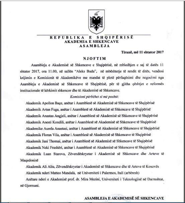 Asambleja e Akademisë së Shkencave e Shqipërisë, në mbledhjen e saj të datës 11 shtator 2017, ora 11.00, në allen “Aleks Buda”, në mbështetje të rendit të ditës, vendosi krijimin e Komisionit të Akademikeve me mandat të plotë përfaqësimi dhe negocimi nga Asambleja e Akademisë se Shkencave të Shqipërisë, për të gjitha çështjet e reformës institucionale të kërkimit shkencor dhe të Akademisë së Shkencave.
