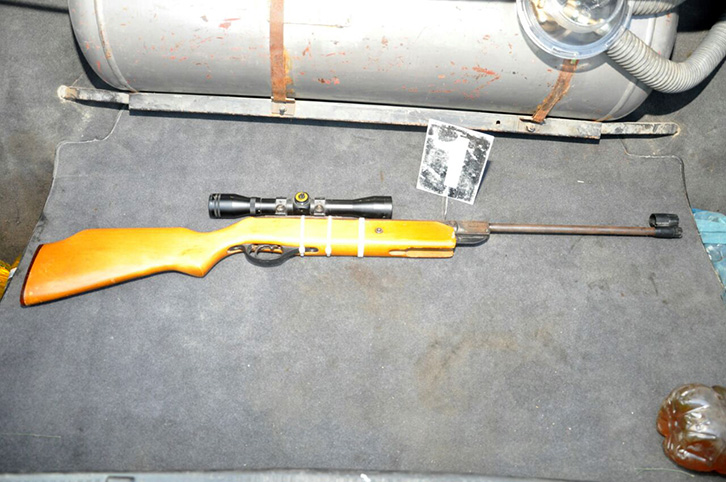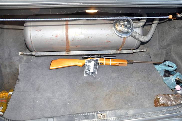 Gjatë kontrollit të ushtruar në automjetin e shtetasit të lartpërmendur Policia gjeti dhe sekuestroi në cilësinë e provës materiale:, një armë sportive e llojit pushkë pneumatike, në të cilën ishte montuar një pajisje optike (dylbi), si dhe një kuti me saçme metalike të kalibrit 4.5 mm.