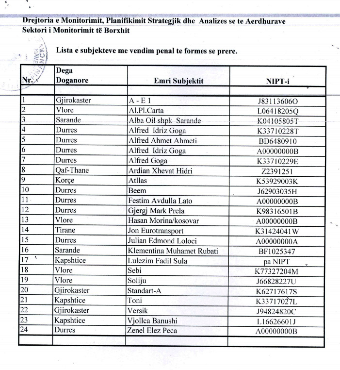 Në një shkresë të firmosur nga zëvendësdrejtori i Përgjithshëm i Doganave Arben Seferi në datë 30 gusht 2017 jepen edhe 24 bizneset që janë të dënuar me një vendim të formës së prerë dhe që duhet të kihen parasysh nga Degët Doganore, drejtoria e Hetimit si dhe Drejtoria e Teknologjisë së Informacionit gjatë kryerjes së procedurave në zbatim të ligjit 33/2017 “Për pagesën/fshirjen/ shuarjen e detyrimeve tatimore detyrimeve të pagueshme në doganë si dhe procedurës së heqjes nga qarkullimi të mjeteve të transportit pas fshirjes/shuarjes së detyrimeve tatimore”.