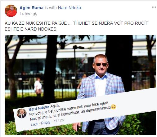 Ky i fundit me një postim ne faqen e tij në “Facebook”, teksa bën tag Ndoken, shkruan: “Ku ka zeë nuk është pa gjë… Thuhet se njëra vote pro Rucit është e Nard Ndokës”.