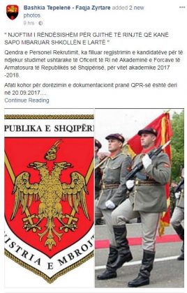 Faqja Zyrtare e Bashkisë së Tepelenës në rrjetin social Facebook, ka shpërndarë një njoftim që u bën thirrje të rinjve të bëhen pjesë e Ushtrisë Shqiptare.