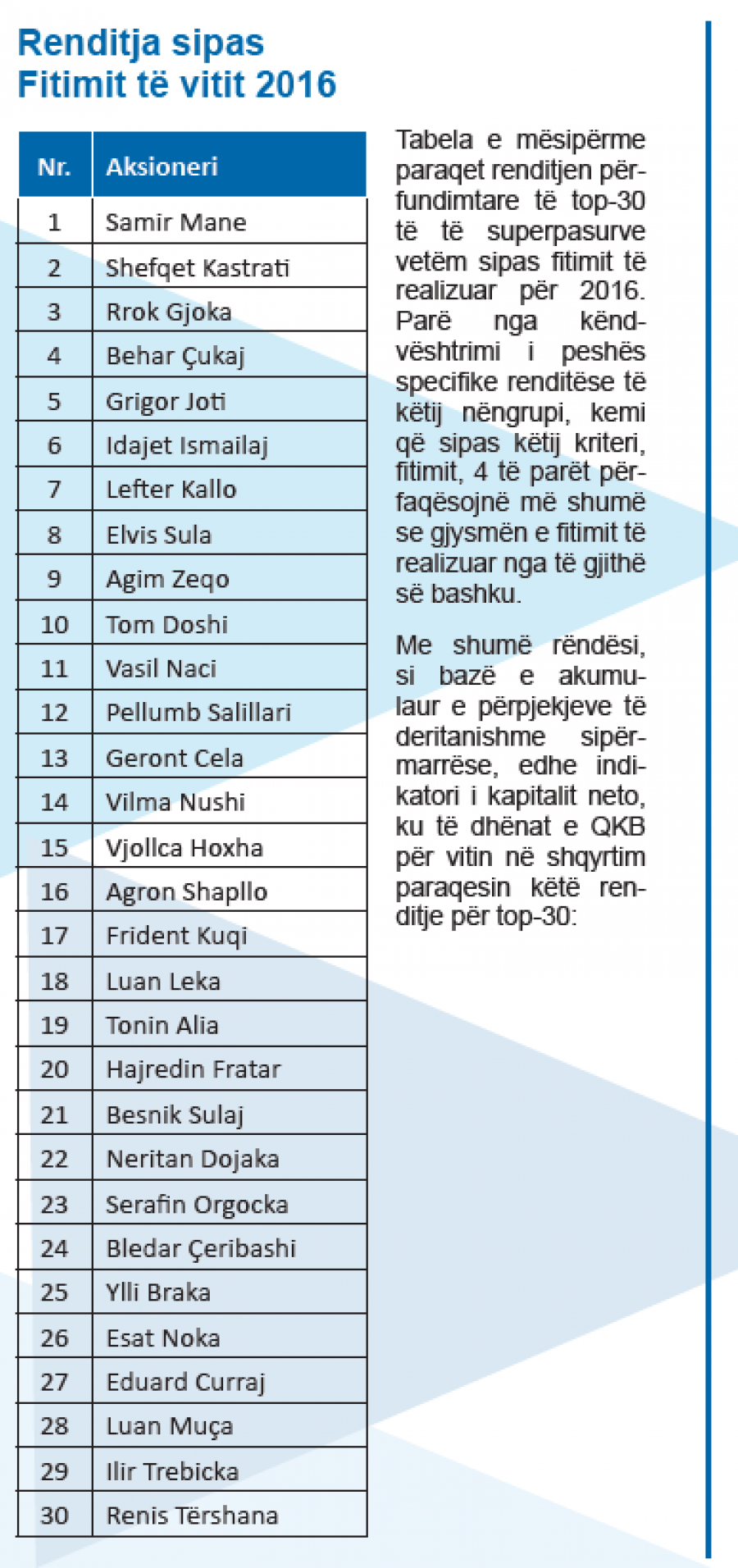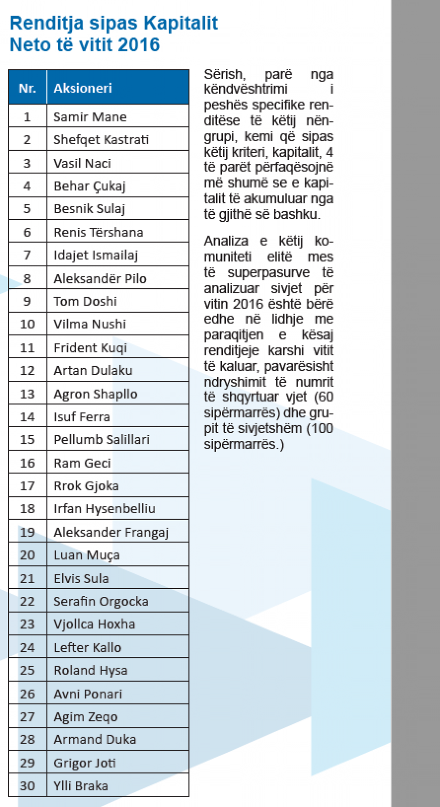 Studimi që rendit 10 sipërmarrësit më të pasur në vend bazohet në analizën e të dhënave zyrtare sipas bilanceve të dorëzuara në QKB. Si rezultat i kësaj analize konkludohet në listën e ponderuar të top-10 më të pasurve të vendit.