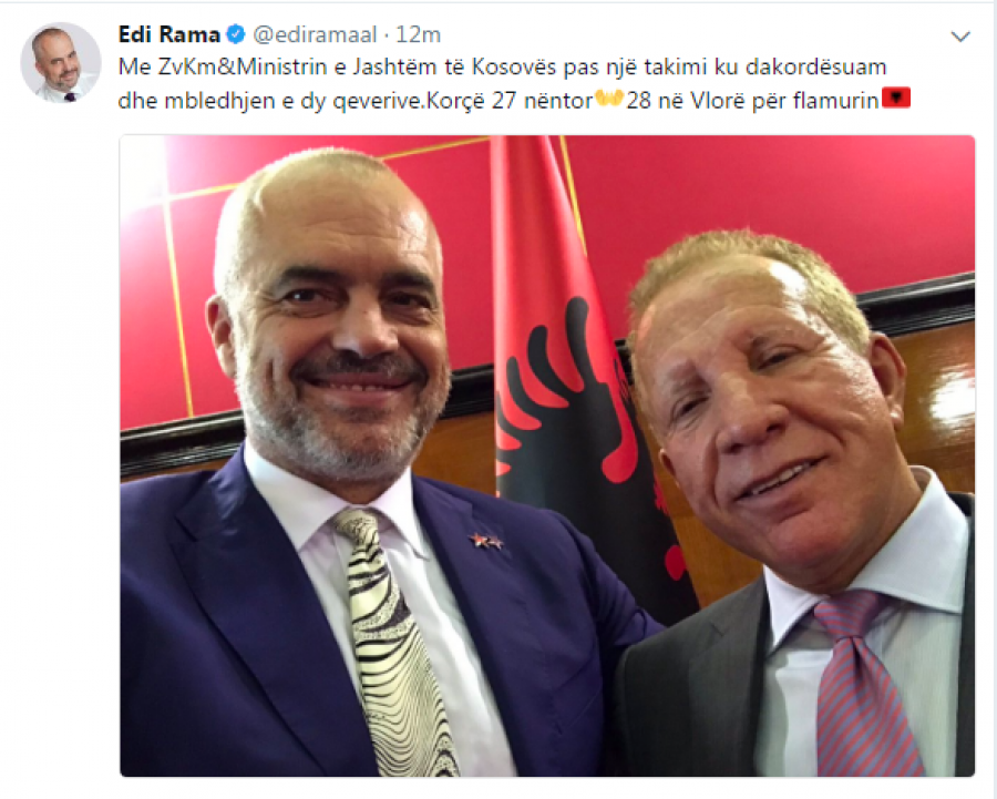 “Me Zv/Km e Ministrin e Jashtëm të Kosovës pas një takimi ku dakordësuam dhe mbledhjen e dy qeverive. Korçë 27 nëntor, 28 në Vlorë për flamurin”, shkruan Rama.