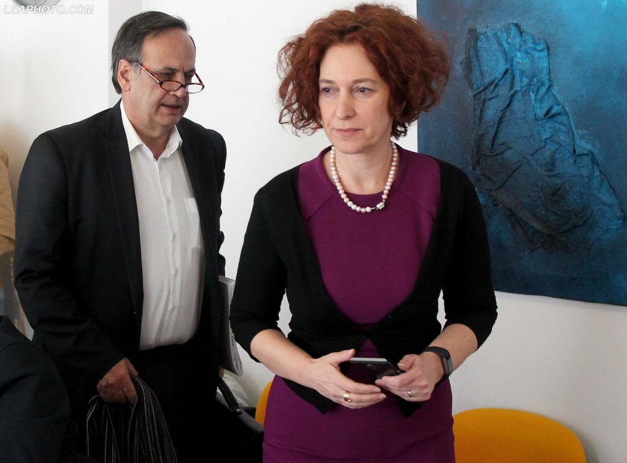 Fleckenstein në takime është i shoqëruar nga ambasadorja e BE në Tiranë, Romana Vlahutin.