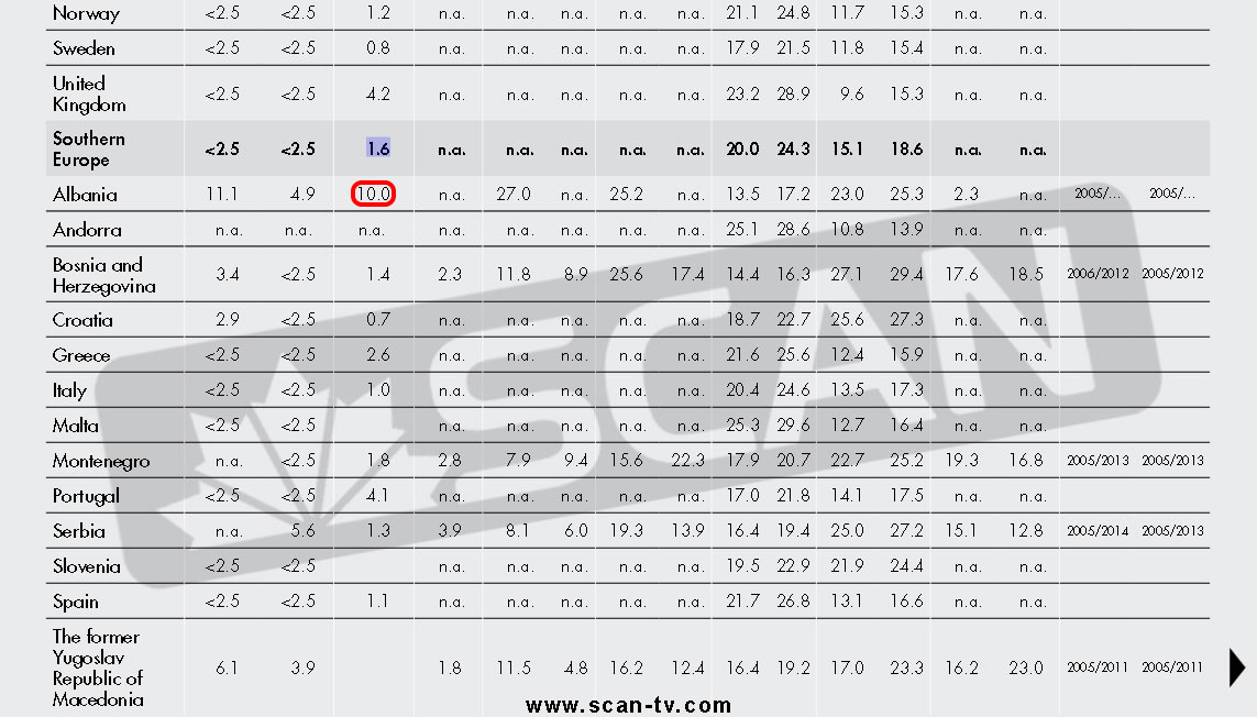 Siç duket qartë edhe nga tabela më poshtë, diferenca me vendet tjera të rajonit është e ndjeshme. Madje, mesatarja e Europës Jugore fiksohet në vetëm 1.6%. Për vendet fqinje ndërkohë, norma zbret nën 2%. Të dhënat i referohen periudhës 2014 – 2016.
