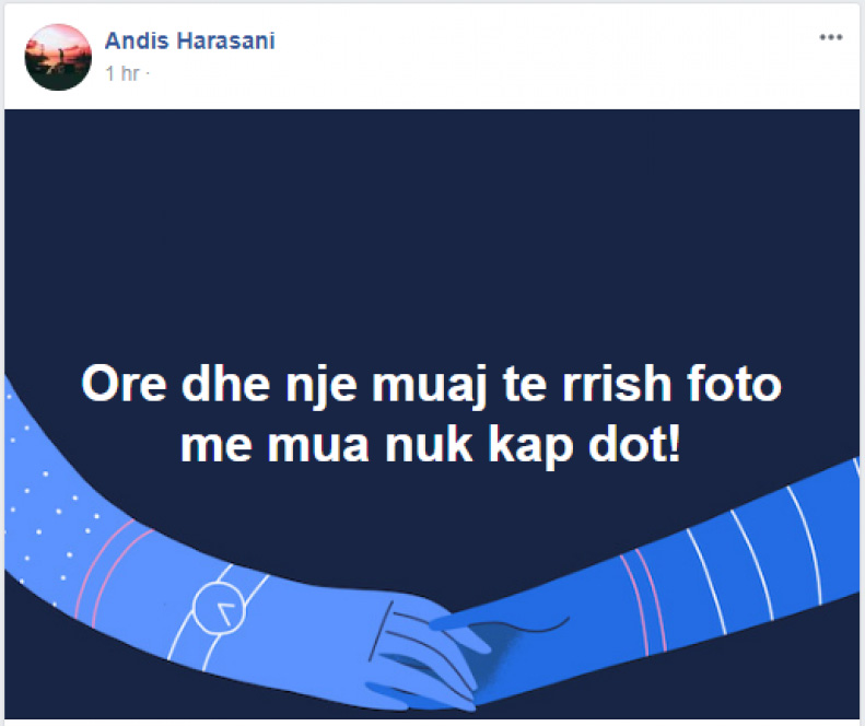 Nëpërmjet një statusi ironik në faqen e tij në “Facebook”, Harasani shkruan: Ore edhe një muaj të rrish, foto me mua nuk kap dot!