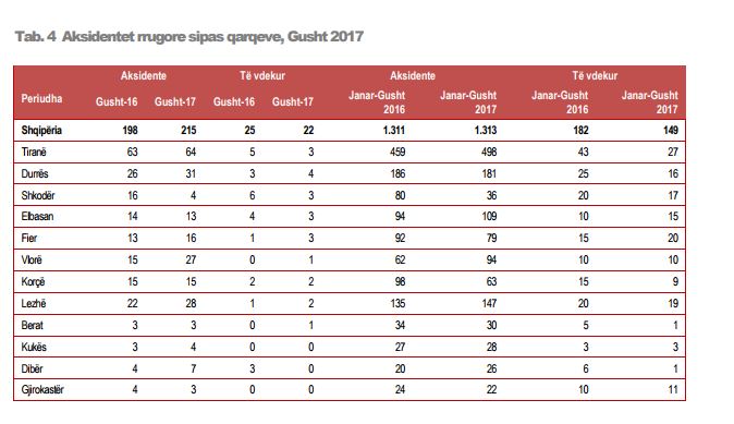 INSTAT ka publikuar raportin sipas të cilit në krahasim me Gusht 2016, numri i aksidenteve është rritur me 8,6 %.