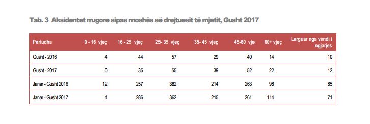 Numri më i lartë i aksidenteve është kryer nga grup mosha 25 – 35 vjeç, duke zënë 25,6 % të numrit të aksidenteve rrugore.