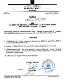 Sakaq, urdhri parashikon edhe periudhën e pushimeve të dimrit për studentët. Ato do të nisin më 25 dhjetor, dhe studentët do të rikthehen në auditor më 6 janar 2018.