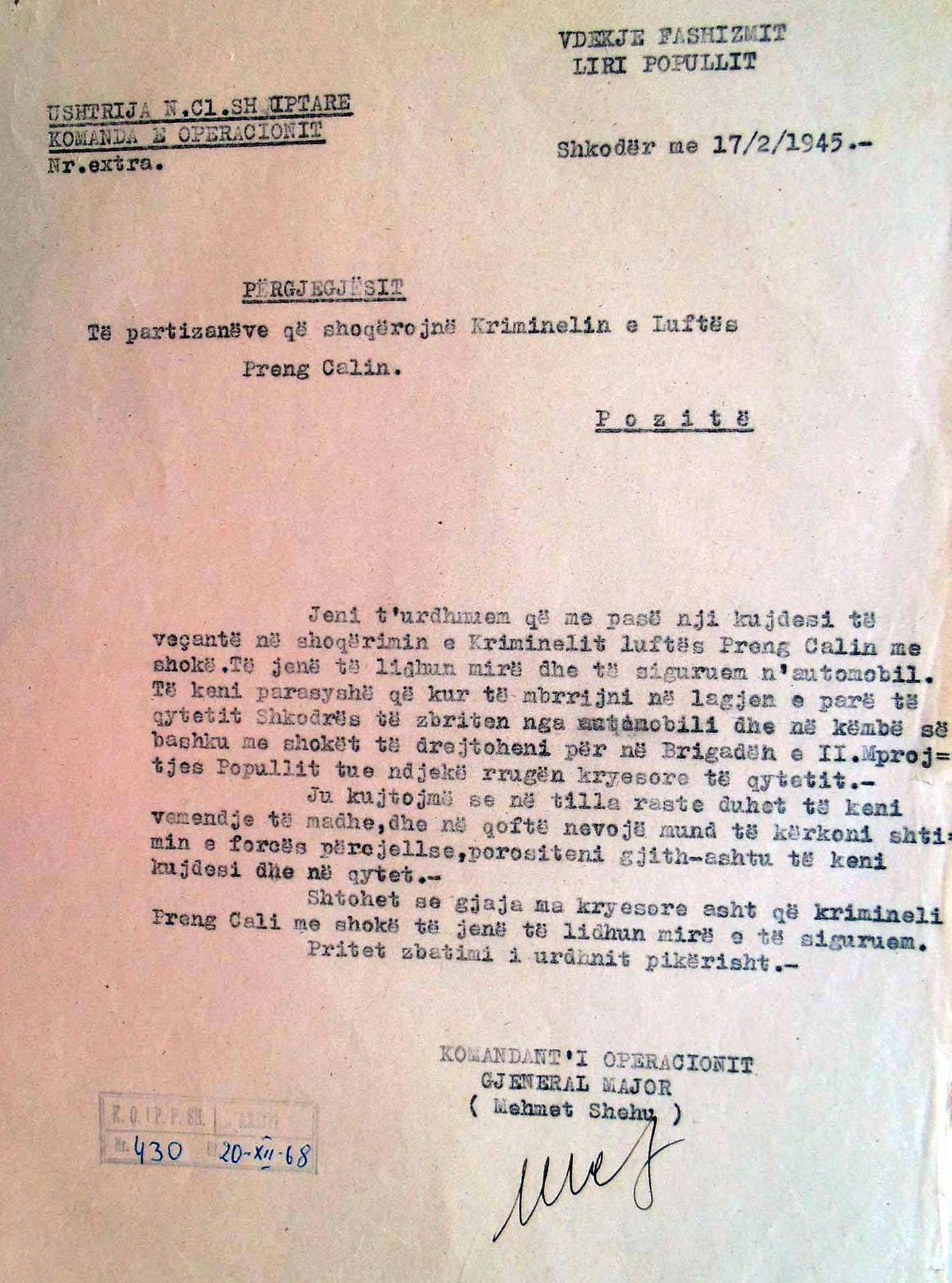Pasi Prek Cali iu dorëzua, më 17.2.1945 komandanti i operacionit.