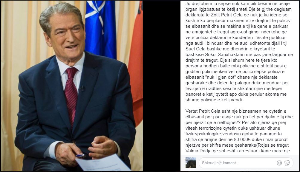 Në mesazhin e “qytetarit dixhital”, të publikuar nga Sali Berisha në “Facebook”, thuhet se Petrit Çela është një ndër personat me të rrezikshëm të këtij qyteti, ku njihet për gjobat që vë ndaj biznesmenëve të ndershëm të Elbasanit.