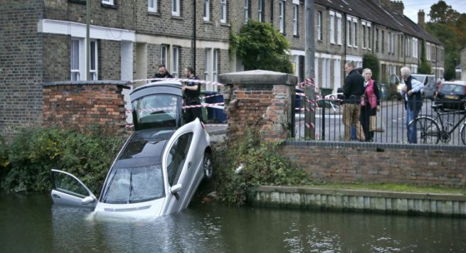 A Mercedes driver had a lucky escape when he ploughed his luxury motor through a wall into a river in Oxford - before abandoning the car. See NTI story NTICRASH; The expensive German motor's front end plunged into the River Thames, leaving the windscreen smashed. Pictures taken at the scene show the flash motor with the driver's door swung open, as neighbours described how the owner walked away and abandoned it near the railway station in Oxford at around 6pm on Friday (22/9). Residents said the man, described as an Asian man in his 20s or 30s, calmly got out of the silver car and walked off after he smashed through the brick wall into the water at "80mph".
