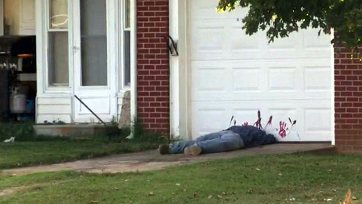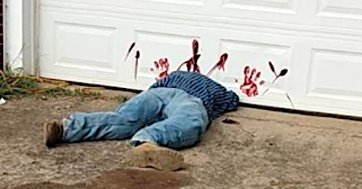Sipas të përditshmes “The Sun”, ai futi letra në rroba për të krijuar trupin e një burri dhe e kompletoi dekorin me bojë të kuqe në derën e garazhit.