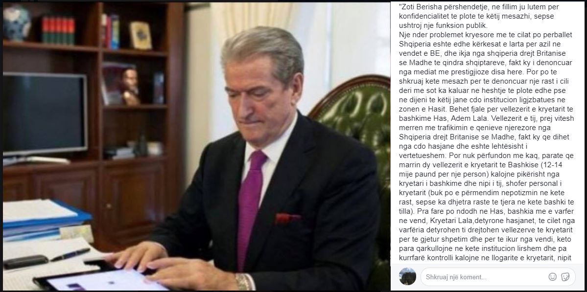 Nje nder problemet kryesore me te cilat po perballet Shqiperia eshte edhe kërkesat e larta per azil ne vendet e BE, dhe ikja nga shqiperia drejt Britanise se Madhe te qindra shqiptareve, fakt ky i denoncuar nga mediat me prestigjioze disa here. Por po te shkruaj kete mesazh per te denoncuar nje rast i cili deri me sot ka kaluar ne heshtje te plote edhe pse ne dijeni te këtij jane cdo institucion ligjzbatues ne zonen e Hasit. Behet fjale per vellezerit e kryetarit te bashkime Has, Adem Lala. Vellezerit e tij, prej vitesh merren me trafikimin e qenieve njerezore nga Shqiperia drejt Britanise se Madhe, fakt ky qe dihet nga cdo hasjane dhe eshte lehtësisht i vertetueshem. Por nuk përfundon me kaq, parate qe marrin dy vellezerit e kryetarit te Bashkise (12-14 mije paund per nje person) kalojne pikërisht nga kryetari i bashkime dhe nipi i tij, shofer personal i kryetarit (buk po e përmendim nepotizmin ne kete rast, sepse ka dhjetra raste te tjera ne kete bashki te tilla). Pra fare po ndodh ne Has, bashkia me e varfer ne vend, Kryetari Lala,detyrone hasjanet, te cilet nga varfëria detyrohen ti drejtohen vellezerve te kryetarit per te gjetur shpetim dhe per te ikur nga vendi, keto para qarkullojne ne kete institucion lirshem dhe pa kurrfarë kontrolli kalojne ne llogarite e kryetarit, nipit dhe vellezerve te tij. Nuk po e bej kete denoncim per te treguar sa keq qeverise kryetari i bashkime, por per te treguar se ai eshte kriminel, dhe per ti bere thirrje institucioneve te vihen menjehere ne lëvizje”.
