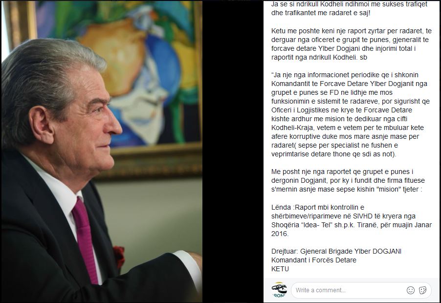 “Ja nje nga informacionet periodike qe i shkonin Komandantit te Forcave Detare Ylber Dogjanit nga grupet e punes se FD ne lidhje me mos funksionimin e sistemit te radareve, por sigurisht qe Oficeri i Logjistikes ne krye te Forcave Detare kishte ardhur me mision te dedikuar nga cifti Kodheli-Kraja, vetem e vetem per te mbuluar kete afere korruptive duke mos mare asnje mase per radaret (sepse per specialist ne fushen e veprimtarise detare thone qe sdi as not).