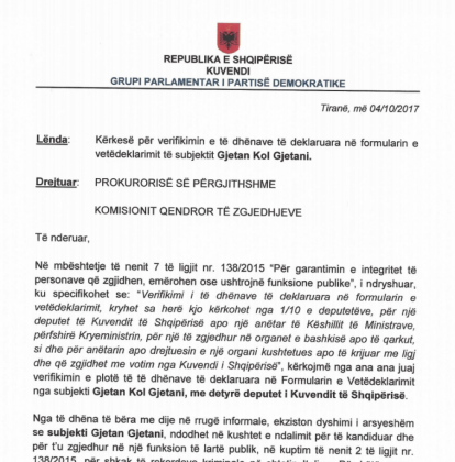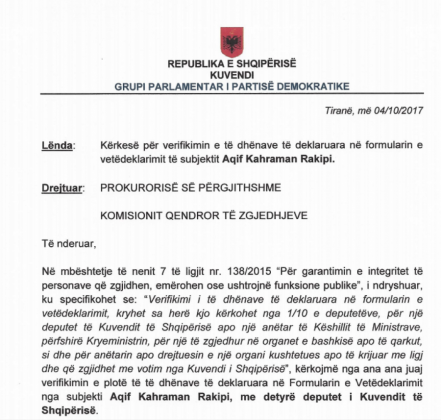 “… kërkojmë nga ana juaj, verifikimin e plotë të të dhënave të deklaruara në Formularin e Vetëdeklarimit nga subjekti Gjetan Kol Gjetani (Aqif Kahreman Rakipi), me detyrë deputet i Kuvendit të Shqipërisë.