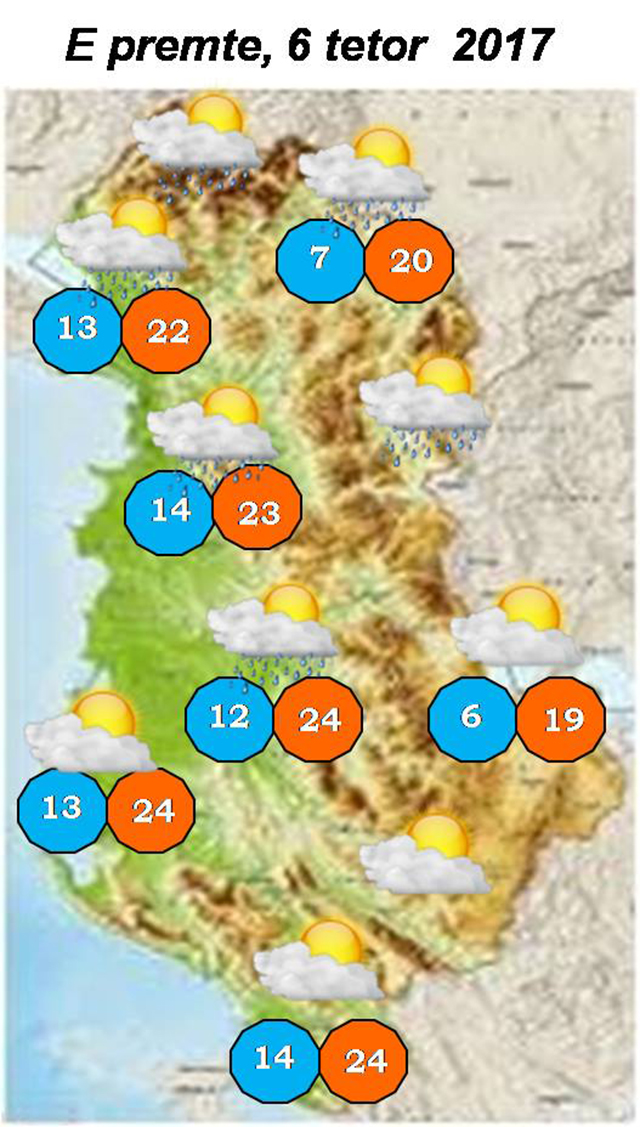 “E PREMTE: Zonat veriore dhe qendrore paraqiten me kthjellime dhe vranësira të shpeshta por mot kryesisht i kthjellët dominon Jugun. Vranësirat shtohen gradualisht duke sjellë shira të dobët në veri dhe qendër.