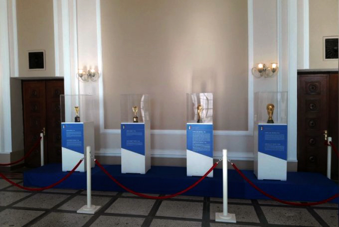 Disa orë para sfidës me Italinë në stadiumin “Loro Boriçi”, ekspozohen katër kupat e Botës të fituara nga Kombëtarja e këtij shteti. Ato janë vendosur në hollin e Teatrit “Migjeni” dhe do të qëndrojnë aty deri në përfundimin e ndeshjes dhe në largimin e sportistëve italianë.