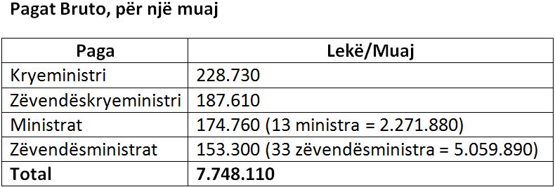 Kabineti i ri qeveritar do ti kushtojë buxhetit të shtetit 7.7 milionë lekë të reja në muaj për pagat bruto.