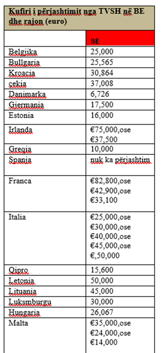 Shqipëria aktualisht ka një nivel të ngjashëm pragu me Bashkimin Europian për aplikimin e Tatimit mbi Vlerën e Shtuar te bizneset.