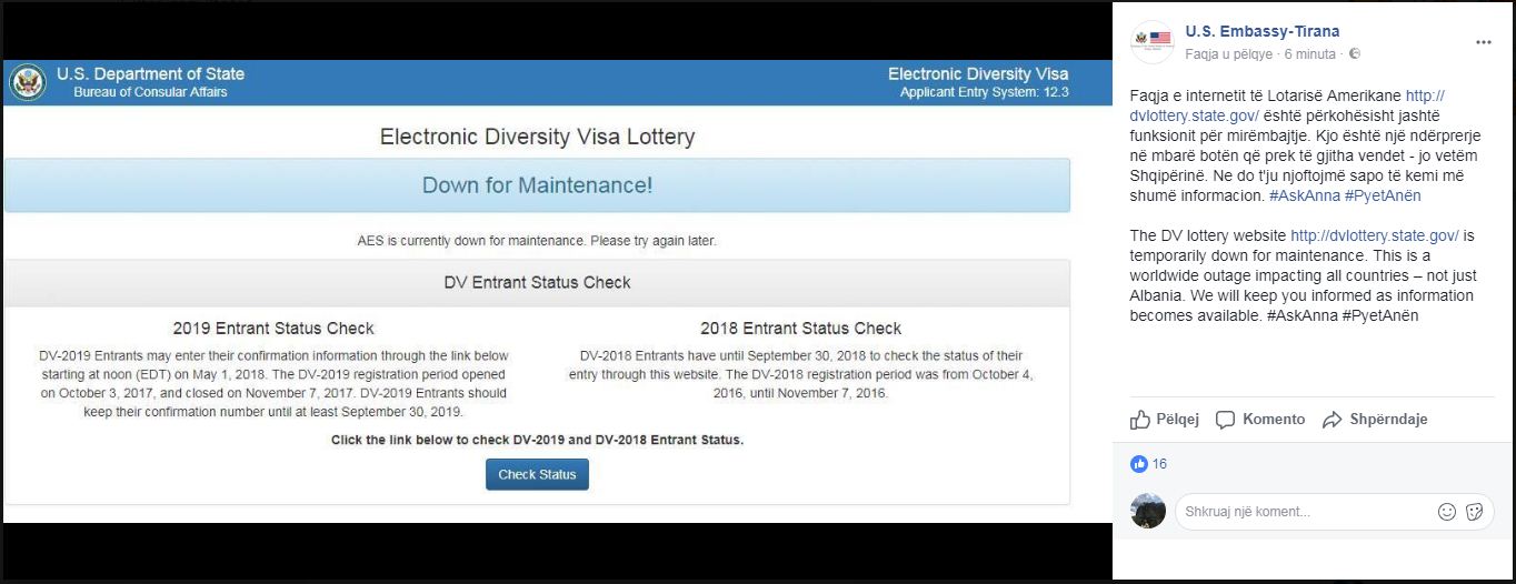 The DV lottery website http://dvlottery.state.gov is temporarily down for maintenance. This is a worldwide outage impacting all countries – not just Albania. We will keep you informed as information becomes available. #AskAnna #PyetAnën