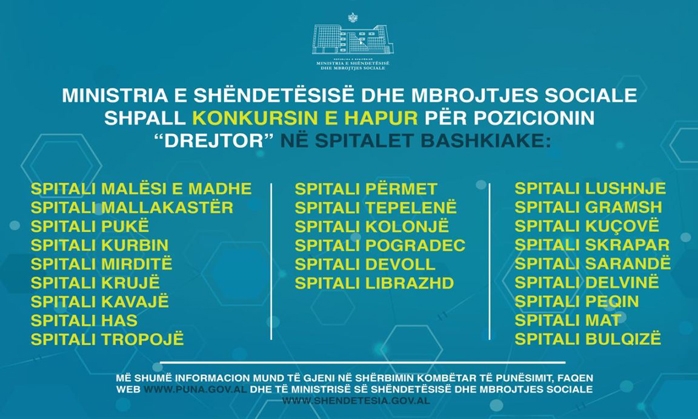 Në mbështetje të nenit 102, pika 4 e Kushtetutës së Republikës së Shqipërisë, Vendimit të Këshillit të Ministrave nr. 173, datë 07. 03. 2003, “Për emërimin, lirimin ose shkarkimin nga detyra të drejtuesve të institucioneve, në varësi të Këshillit të Ministrave, Kryeministrit ose të Ministrit, VKM nr. 508, datë 13. 09. 2017, ”Për përcaktimin e fushës së përgjegjësisë shtetërore të Ministrisë së Shëndetësisë dhe Mbrojtjes Sociale”, Urdhrit nr. 412, datë 12. 10. 2017 “Për procedurat e përzgjedhjes dhe emërimit të drejtuesve të spitaleve Bashkiake”, Ministria e Shëndetësisë dhe Mbrojtjes Sociale shpall konkursin e hapur për pozicionin “Drejtor” të spitaleve.