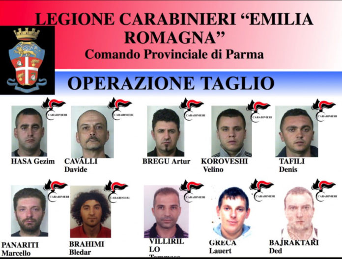 Të arrestuarit në mars 2014, Artur Bregu, 36 vjeç, i cili banonte në Brescello zyrtarisht si një punëtor me një jetë modeste, Marcello Panariti, italian, 37 vjeç. Velino Koroveshi, lindur në Shqipëri, 27 vjeç, Lauert Greca, lindur në Shqipëri, 27 vjeç, Gëzim Hasa, nga Shqipëria, 32 vjeç, Denis Tafili, 32 vjeç, i burgosur në burgun e Parmas, Ded Bajraktari, i lindur në Shqipëri, 26 vjeç, Bledar Brahimi, 32 vjeç si dhe disa shtetas italianë.