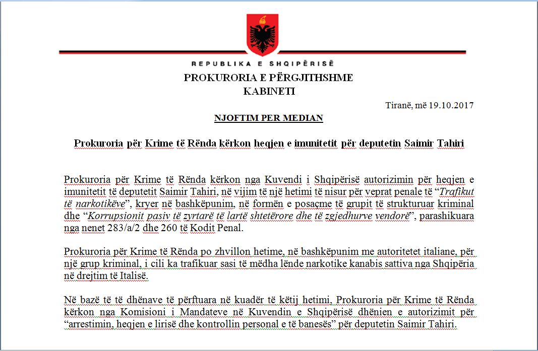Në bazë të të dhënave të përftuara në kuadër të këtij hetimi, Prokuroria për Krime të Rënda kërkon nga Komisioni i Mandateve në Kuvendin e Shqipërisë dhënien e autorizimit për “arrestimin, heqjen e lirisë dhe kontrollin personal e të banesës” për deputetin Saimir Tahiri.